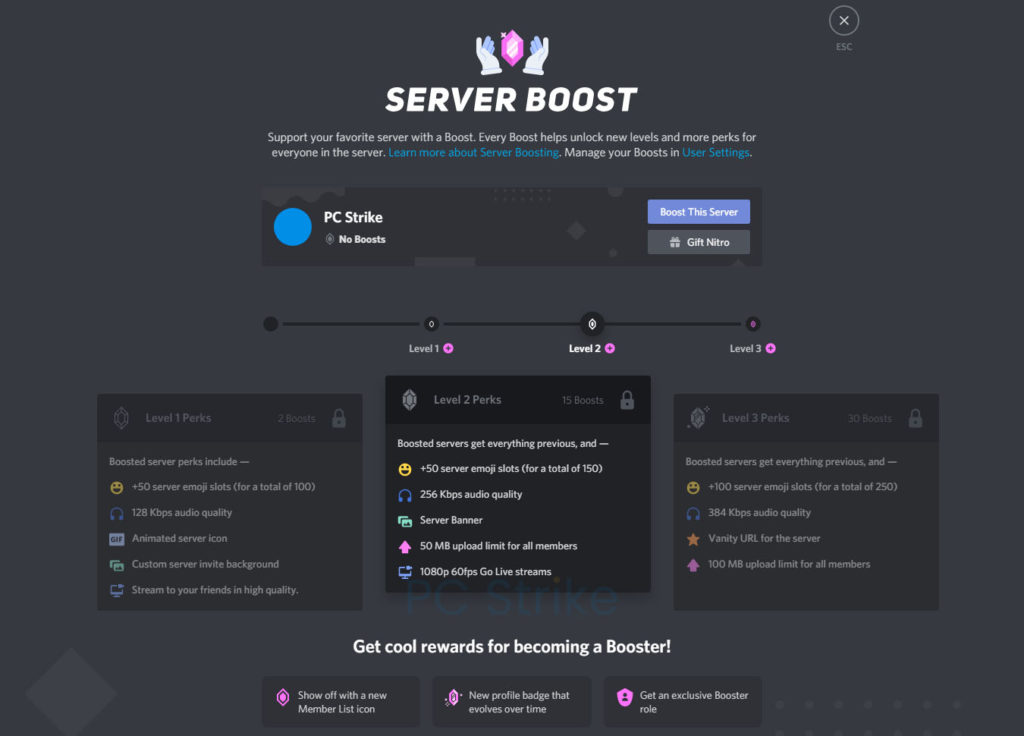 You can start with the discord name generator to come up with cool discord server names along with great discord server logo designs... Enter a slogan (if you've got one) Boosted servers show up more frequently, and the more coins used for boosting, the higher position the listing will receive. 24/02/2021 · your server will need level one perks to use animated icons and this can be achieved by getting two boosts. 30/10/2019 · if you are a current nitro subscriber and have already boosted a server, that server will automatically gain that fresh new second server boost as well! But since we've just automatically added a new boost to the already boosted server, you can move that new second server boost to … Boosts with coins lasts for 30 days, and can be stacked. After signing up, you automatically get two boosts you can apply to your server.