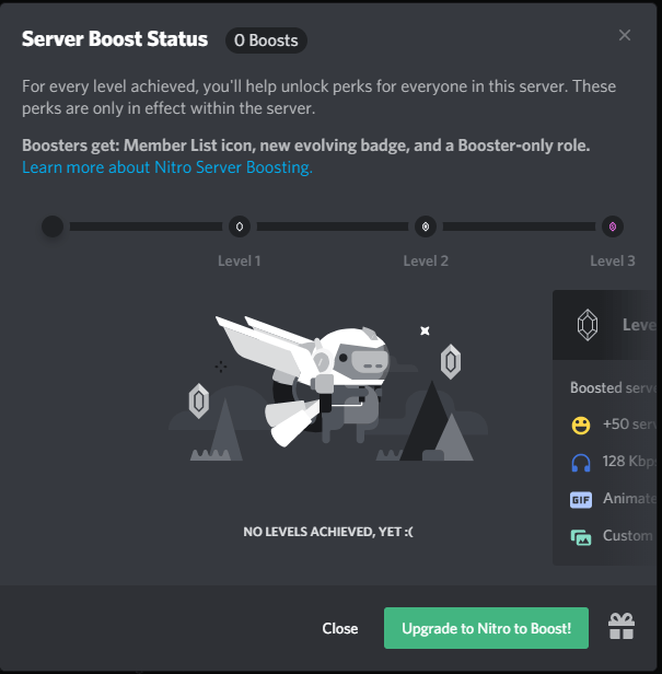Boosted servers show up more frequently, and the more coins used for boosting, the higher position the listing will receive... Boosted servers show up more frequently, and the more coins used for boosting, the higher position the listing will receive. 29/07/2020 · nitro boosting helps server. 24/02/2021 · your server will need level one perks to use animated icons and this can be achieved by getting two boosts. Boosts with coins lasts for 30 days, and can be stacked. Your profile will display a badge if you boost at least one server for a certain period. Boosted servers show up more frequently, and the more coins used for boosting, the higher position the listing will receive. Click the settings icon by your profile picture and locate discord nitro under billing settings. The first way to get boosts is by upgrading to discord nitro. Enter a slogan (if you've got one). Your profile will display a badge if you boost at least one server for a certain period.